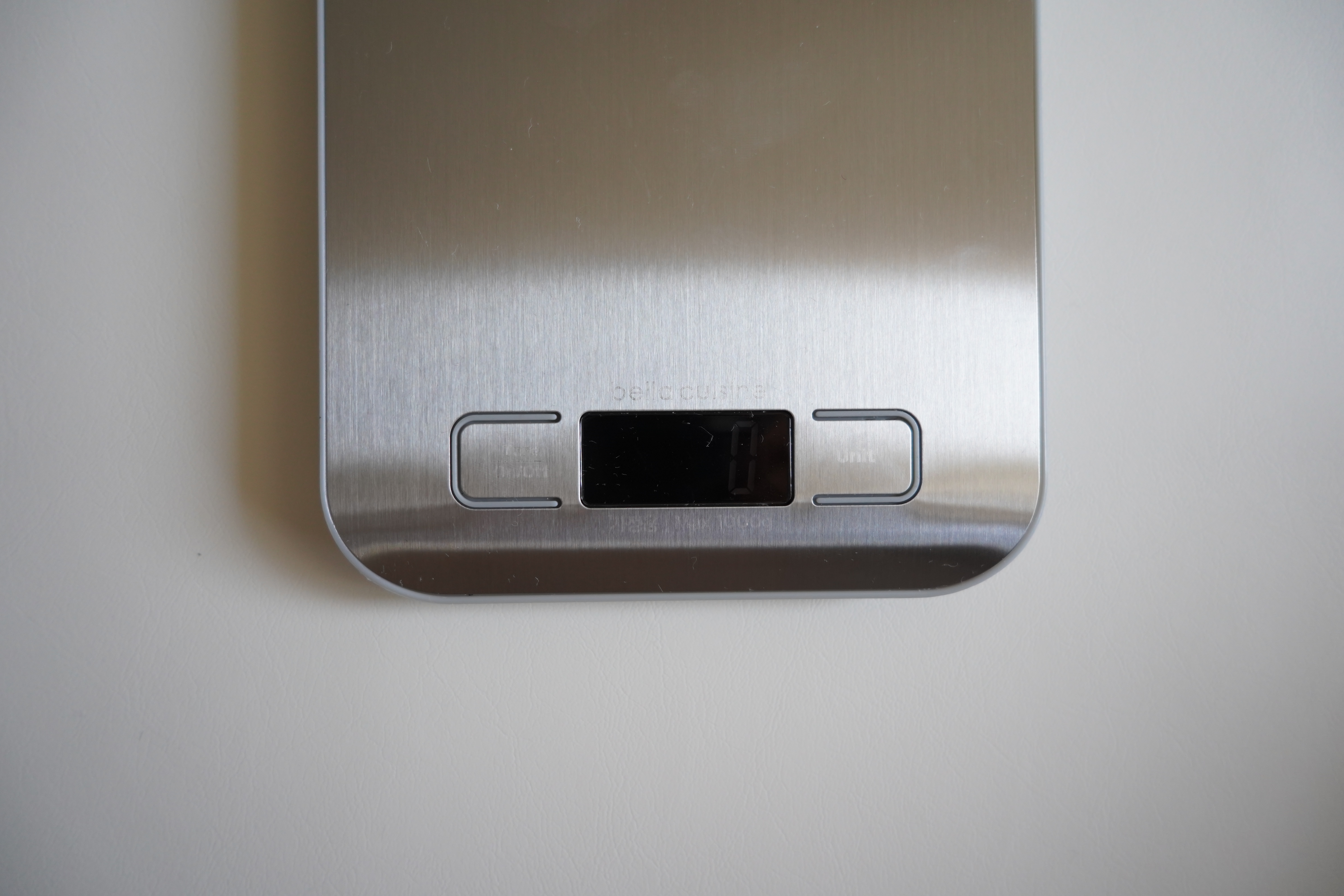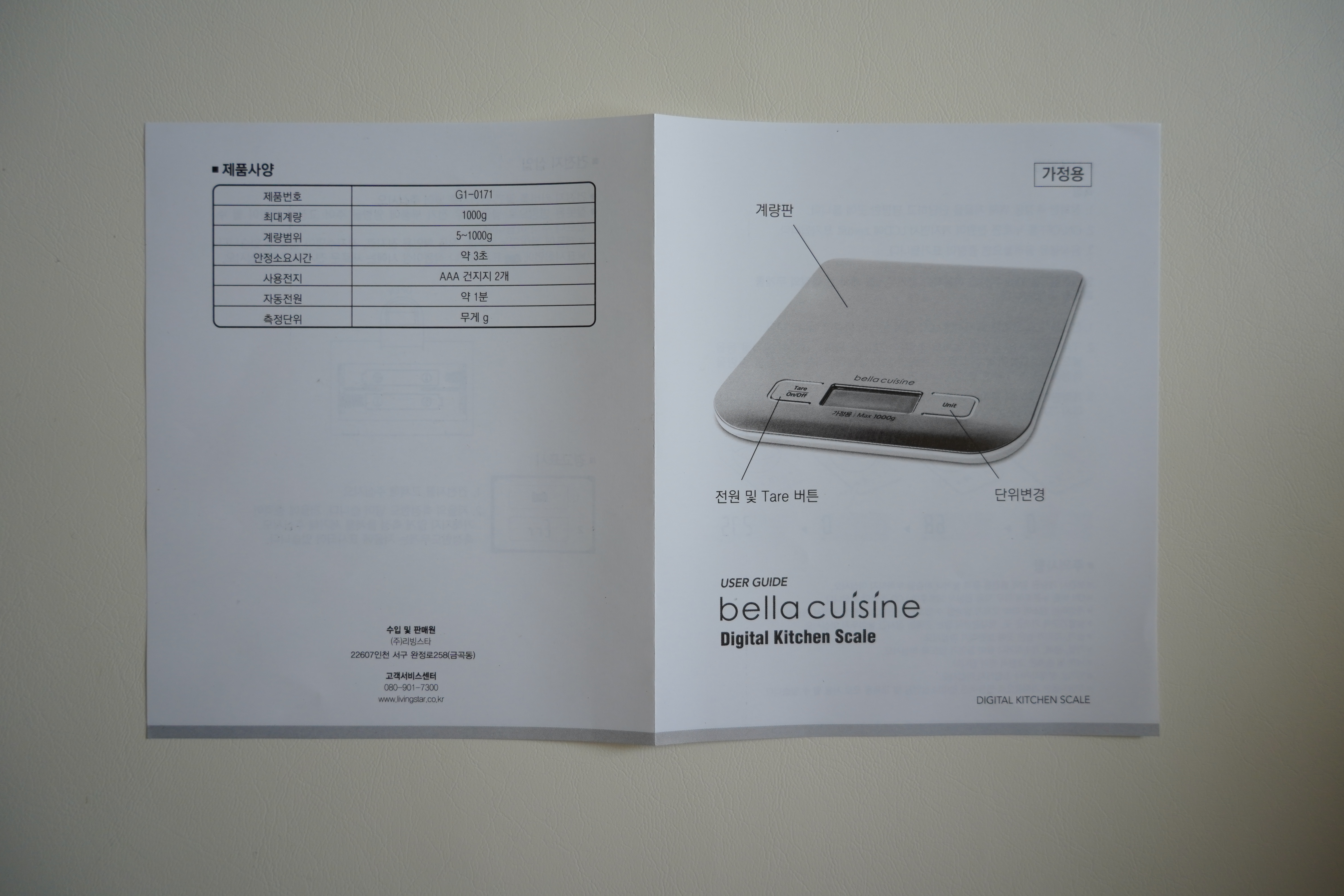 이름은 벨라쿠진(bella cuisine) 주방전자저울 1kg입니다. 이 제품에는 AAA건전지 2개가 같이 동봉되기 때문에 건전지를 따로 구매하지 않고 바로 사용할 수 있어 편리합니다.