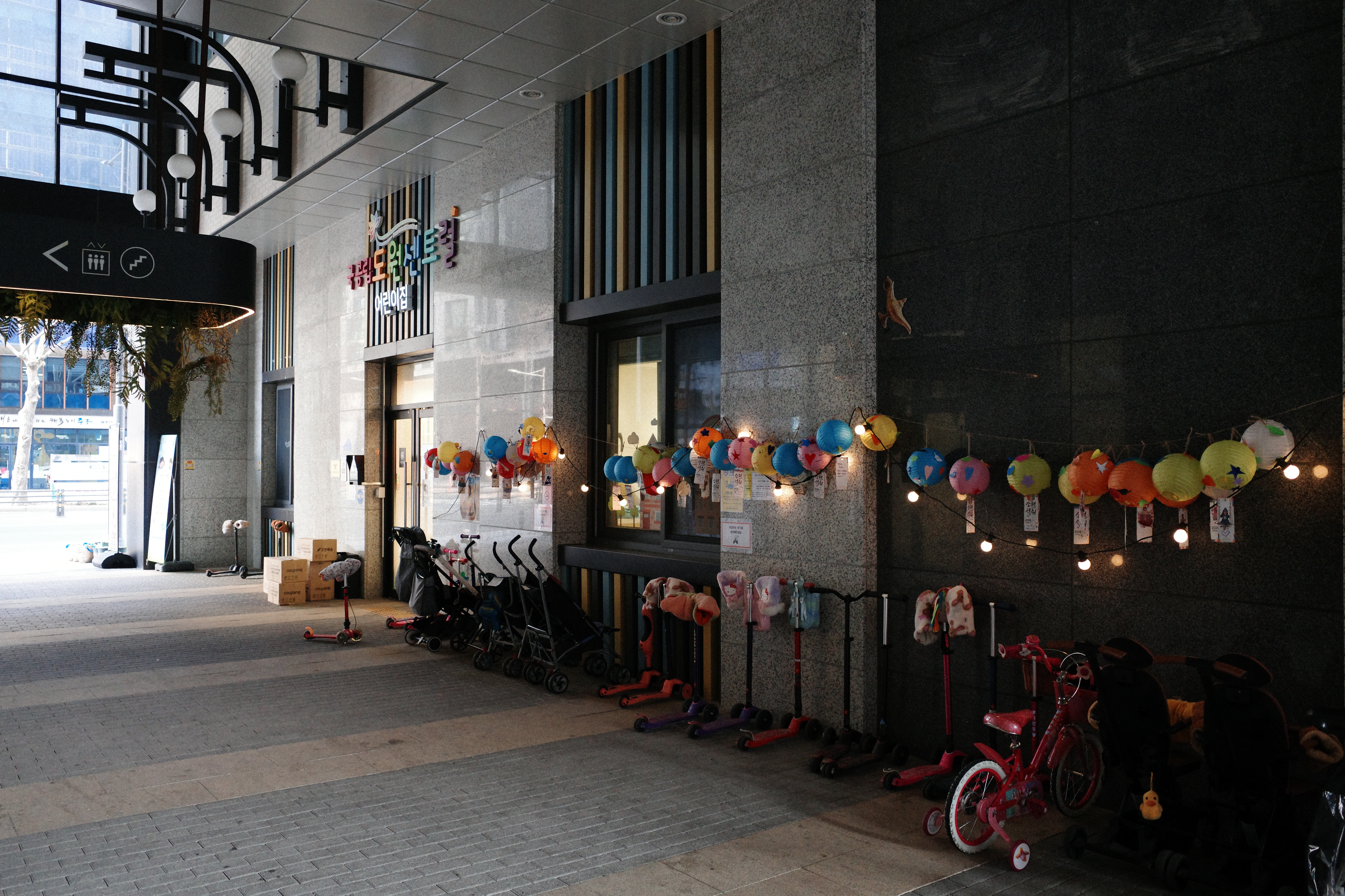 어린이집이 1층에 있다. 킥보드와 자전거가 빼곡하게 늘어져 있다.